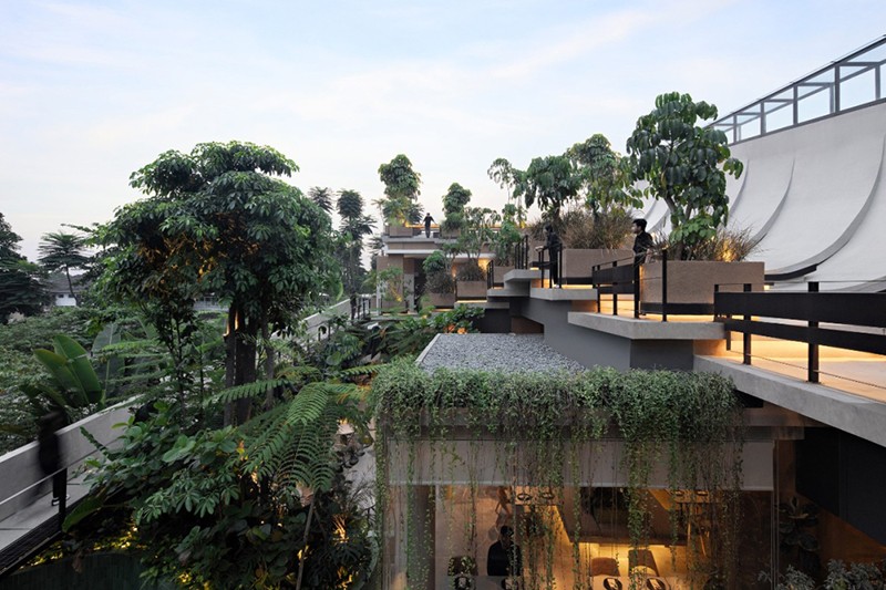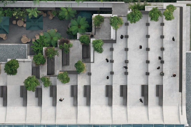 Aruma Split Garden是一個獨特的餐廳項目,占地 2500㎡。其屋頂最為特別,采用了階梯式設計,結合了屋頂、立面、墻壁、對角懸臂結構和家具等多種元素。