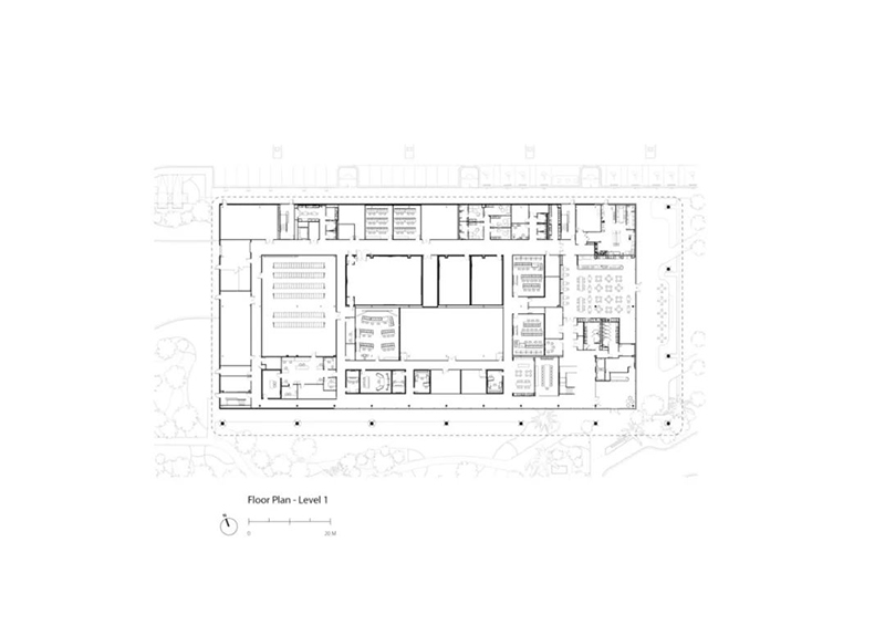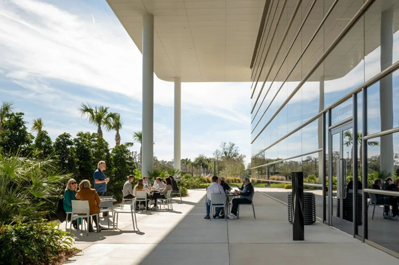 這座新建筑位于TPCSawgrass球員體育場球場南側(cè),緊鄰 PGA巡回賽總部大樓,后者也是由 Foster +Partners 設(shè)計。建筑采用與總部一致的設(shè)計語言,南、東立面設(shè)有寬敞的柱廊,大型懸挑屋頂提供遮蔭,同時,玻璃幕墻確保了充足的自然采光,并可眺望水景及周邊園區(qū)。園區(qū)內(nèi)設(shè)有景觀步道連接兩座建筑,方便員工與訪客通行。建筑材料選用白色金屬、混凝土與玻璃,以保持整體風格的協(xié)調(diào)統(tǒng)一。